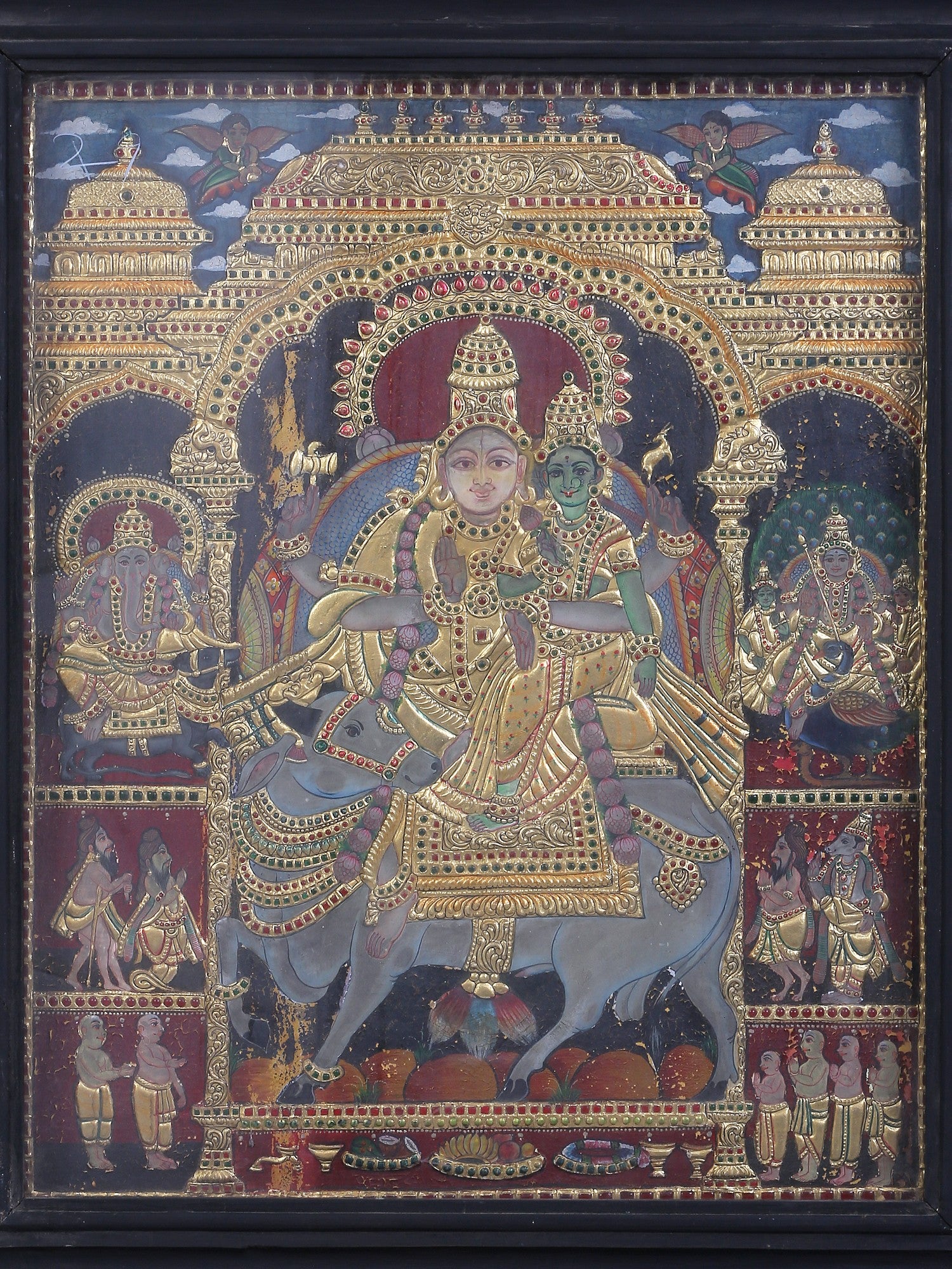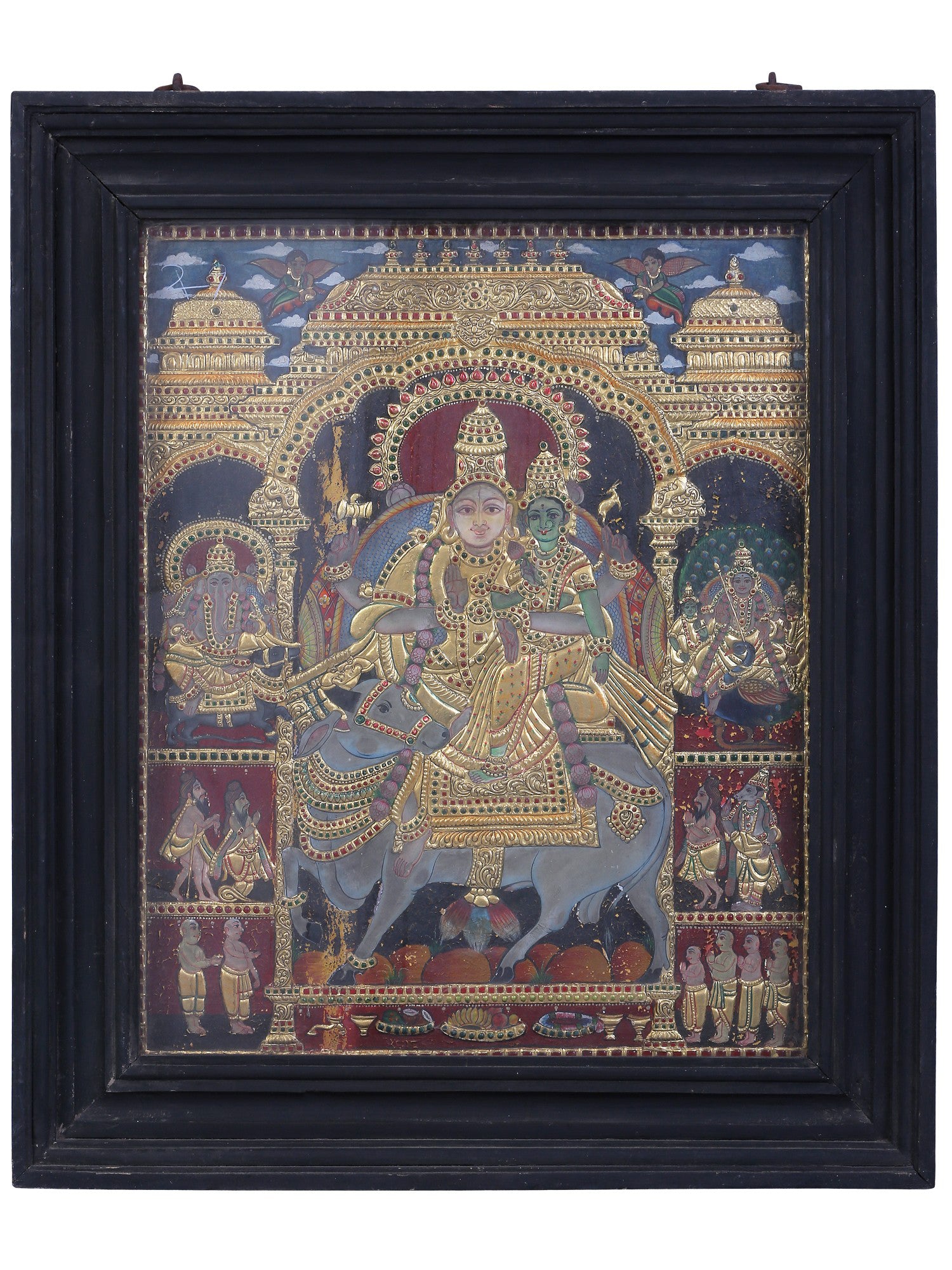 A lateral sweep defines the composition, centred on Shiva and Parvati as Pradosha Moorthy, seated together upon Nandi. Their shared seat creates a unified axis, embodying balance between ascetic force and generative energy, a form especially venerated during the twilight ritual of Pradosham in South Indian Shaiva practice.