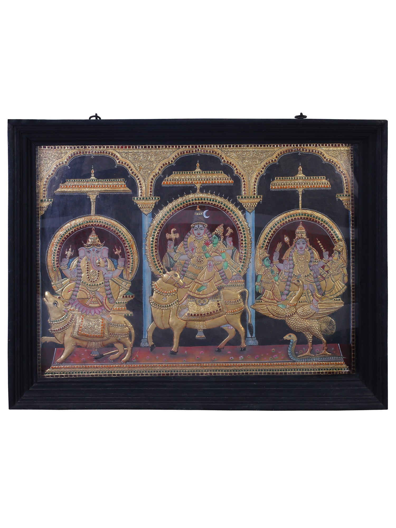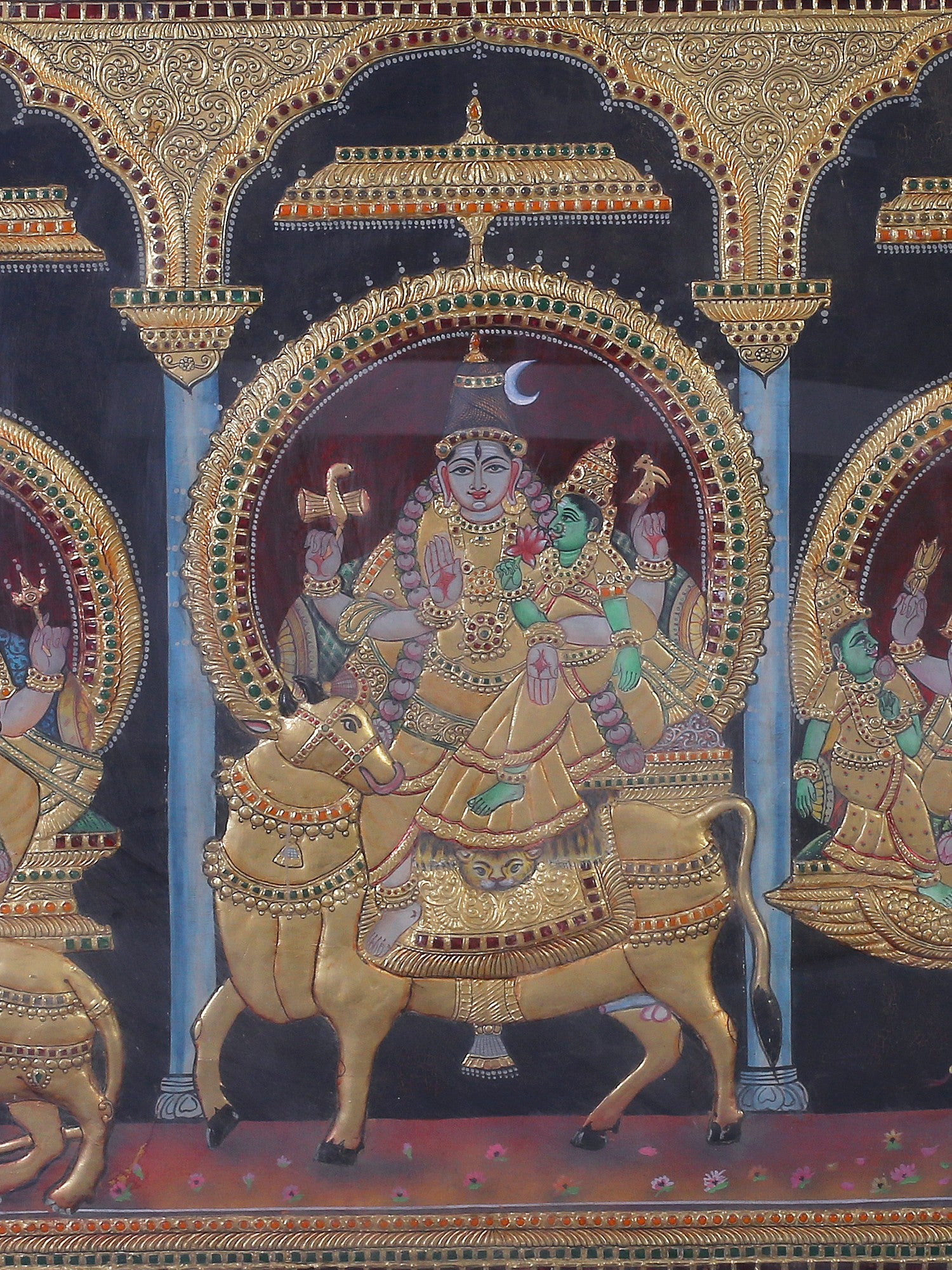 Each figure is contained within a haloed arch, creating three self-contained yet visually linked sanctums. Gold is built up in high relief across crowns, vahanas, and ornamental borders, producing a dense, tactile surface. Against the dark ground, the forms advance in measured symmetry, held within a continuous, luminous band.