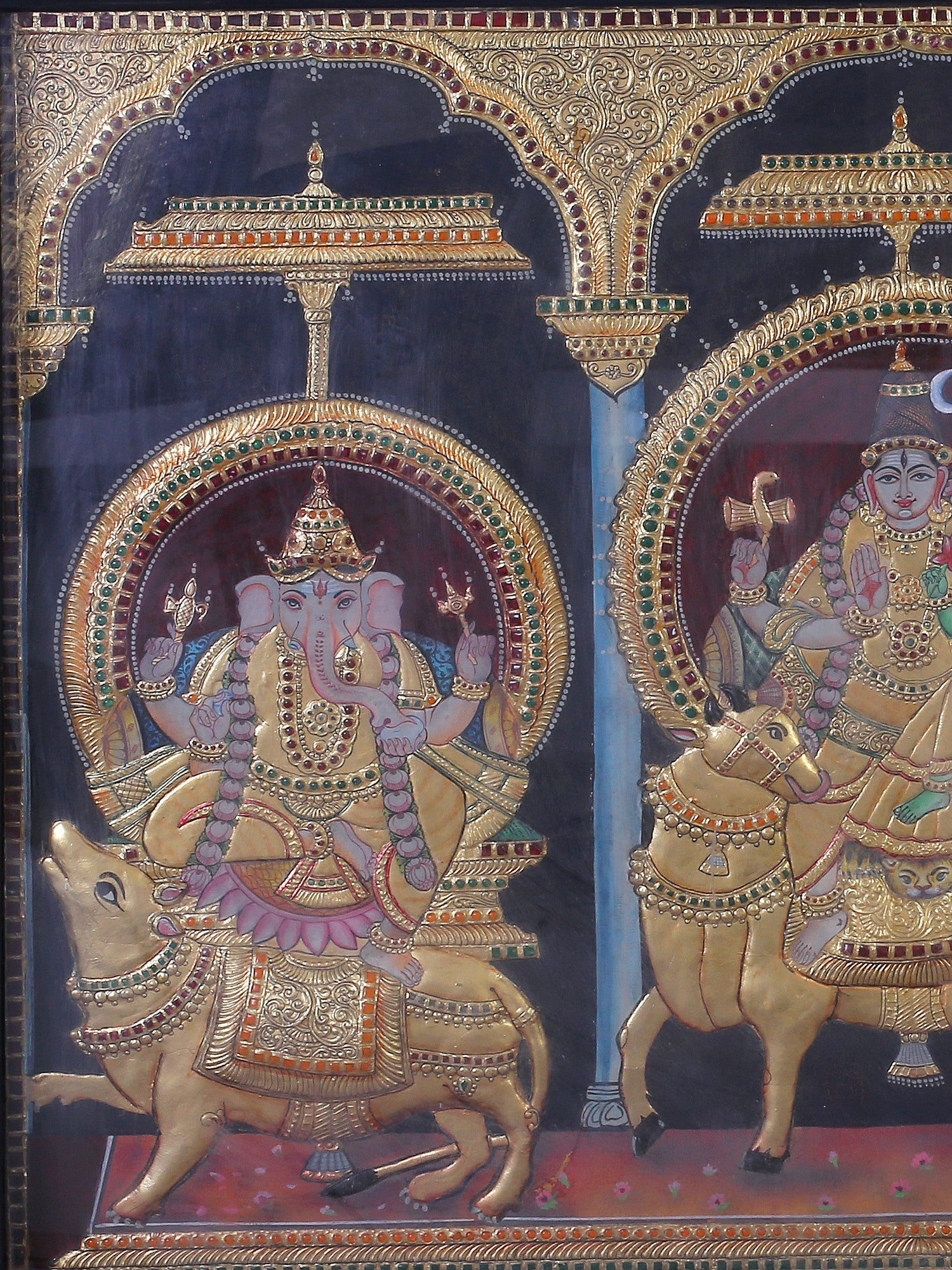 To one side, Ganesha rides the mouse, his rounded form compact within the circular frame, balancing the heavier central mass. Opposite, Kartikeya with Valli and Devasena sits upon the peacock, the bird’s extended body elongating the lateral spread.