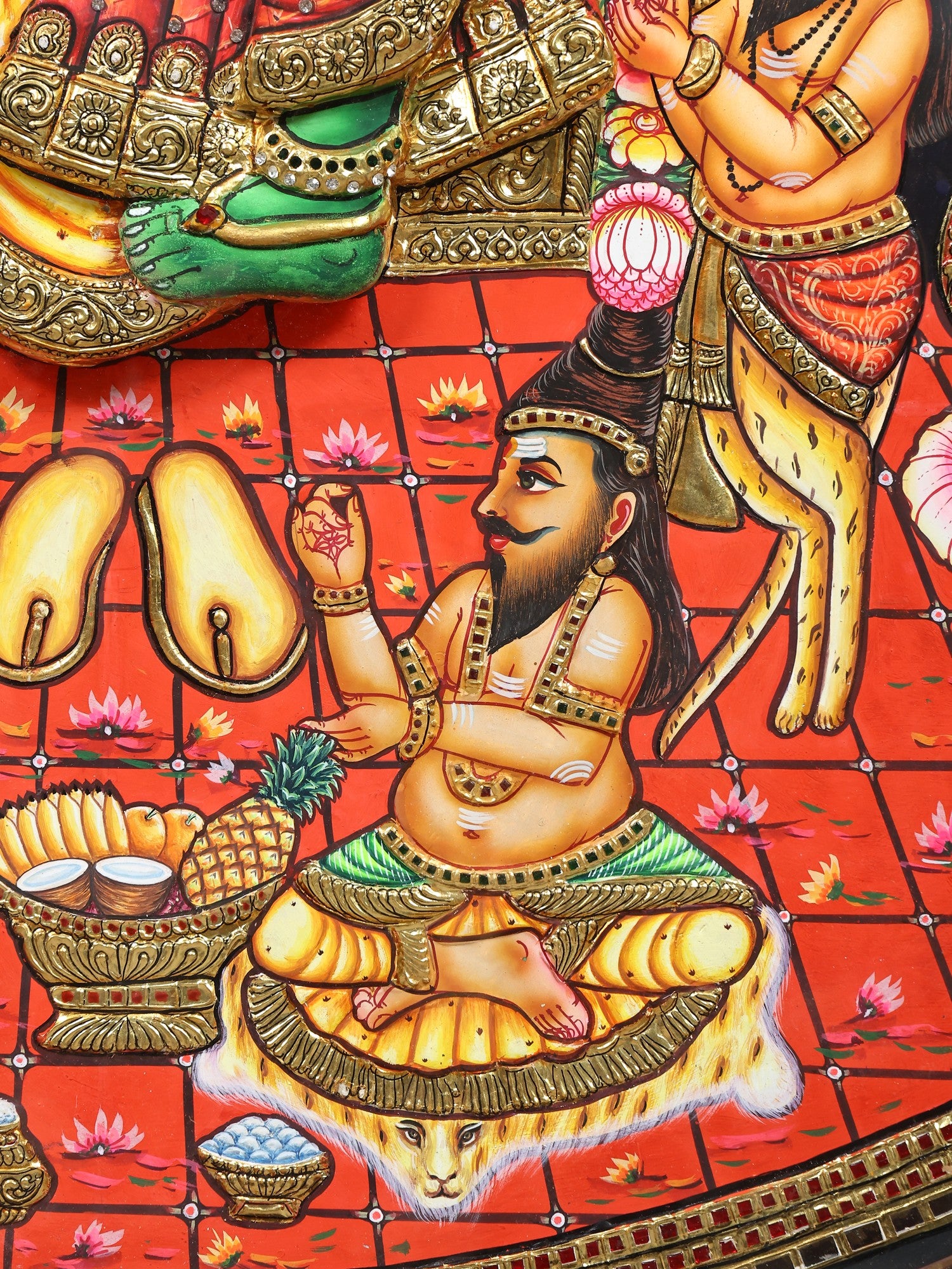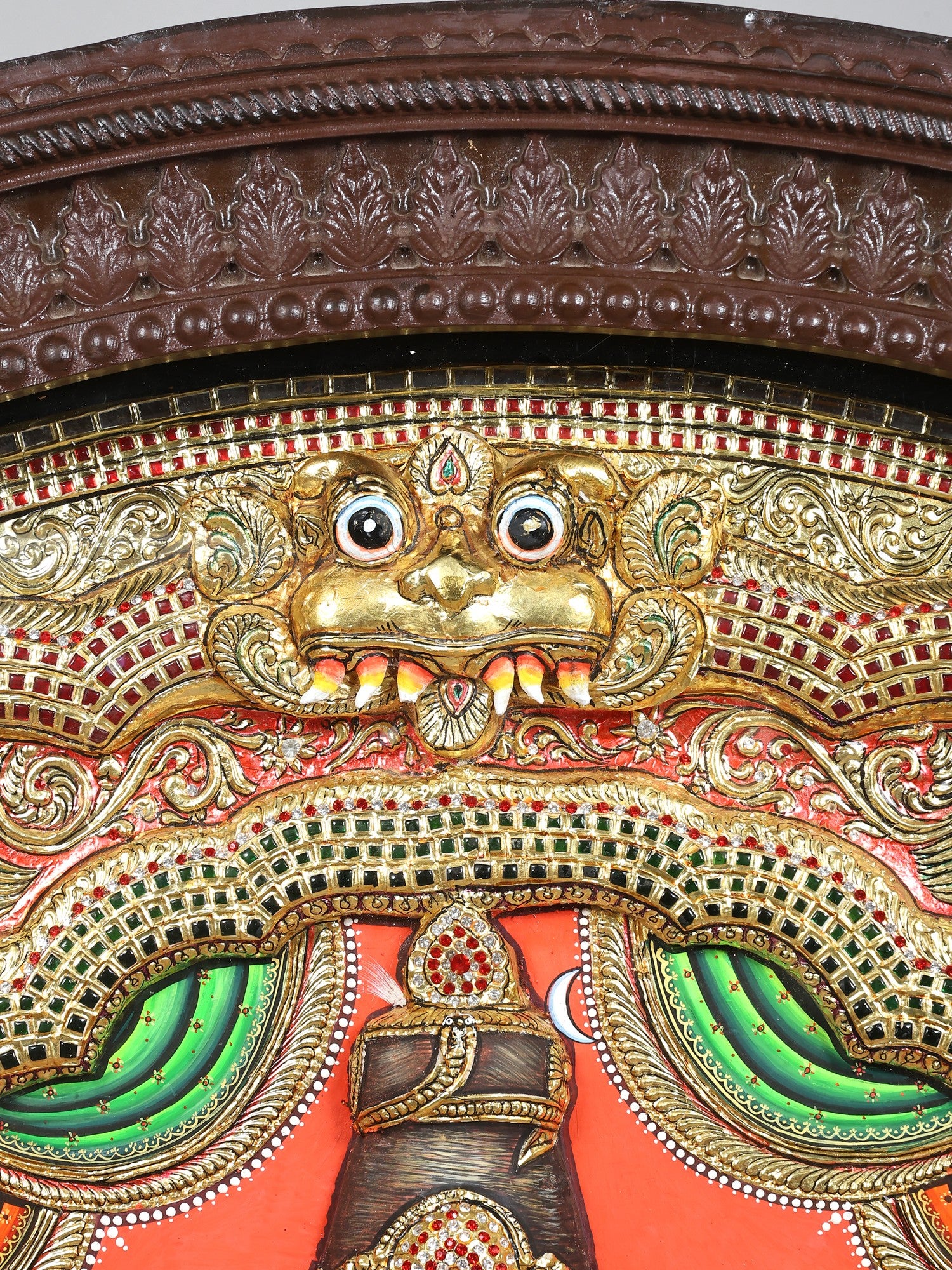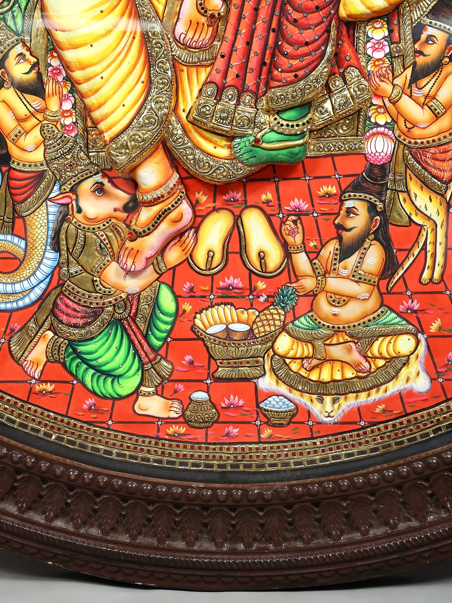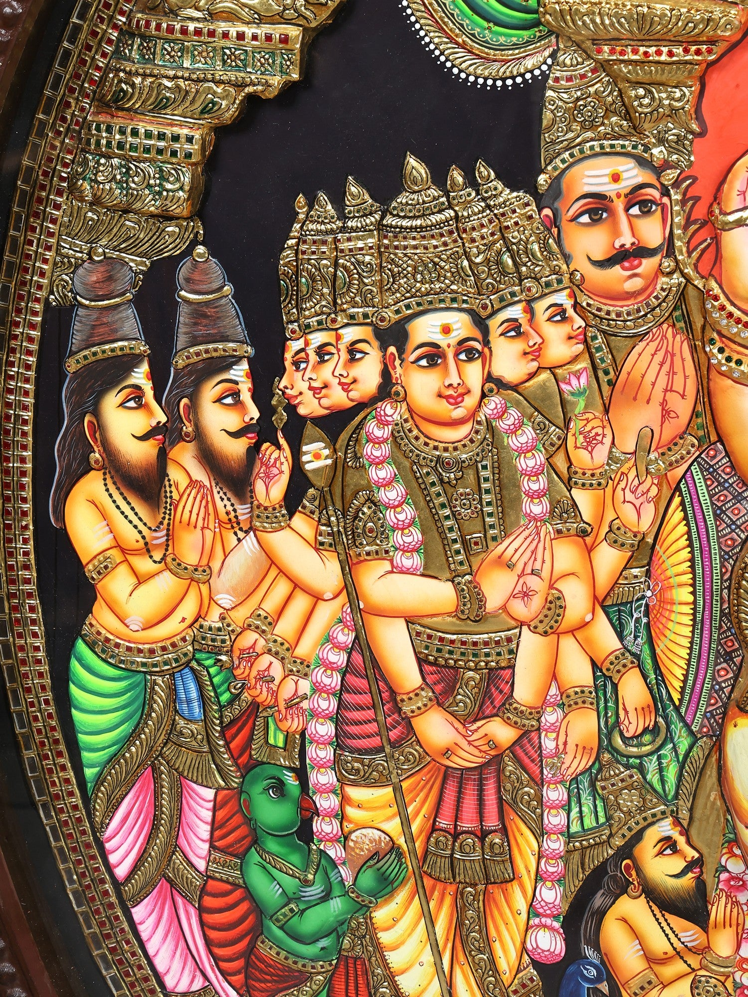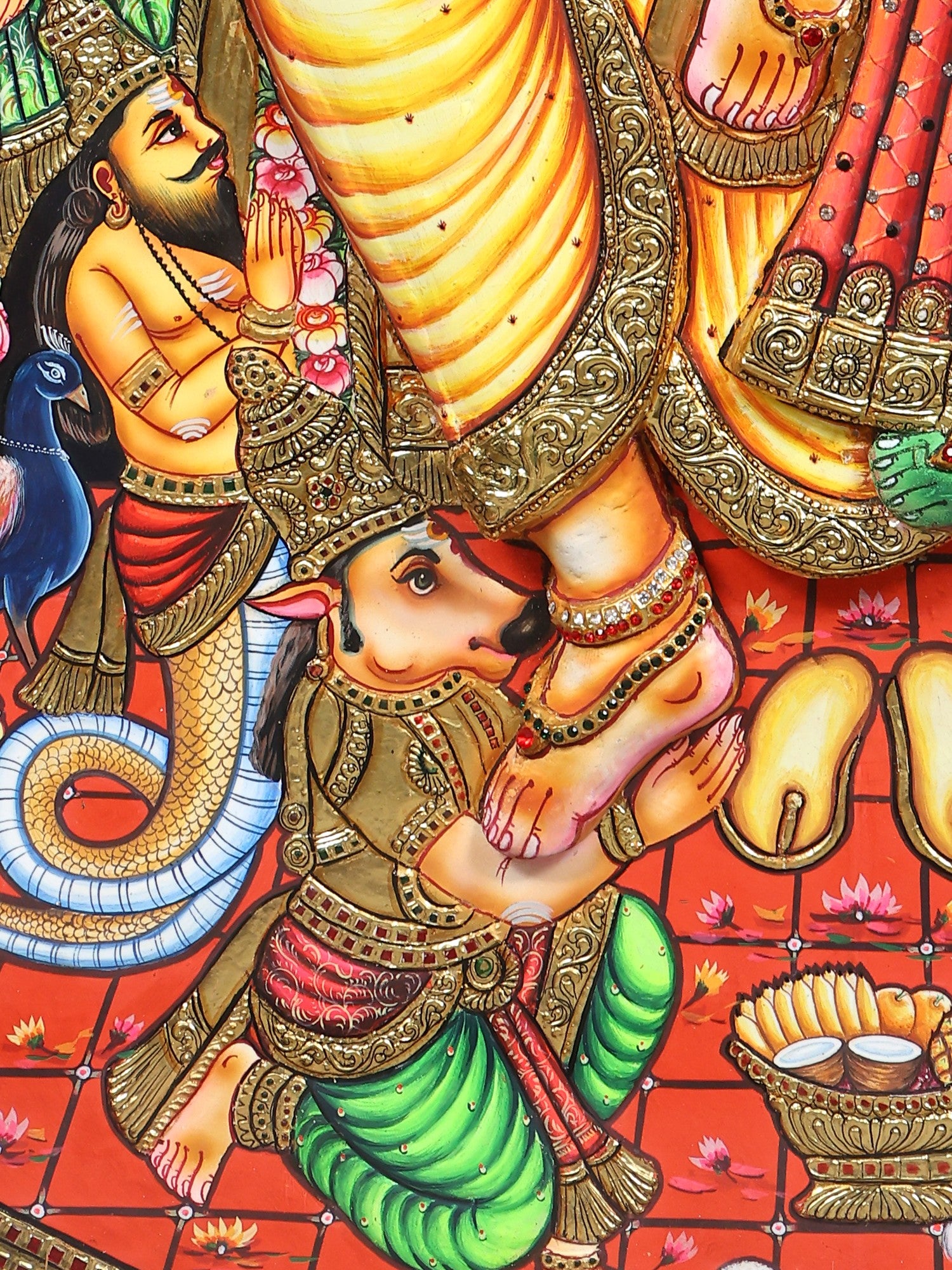Executed in the Tanjore tradition, the gold surface rises in pronounced relief, catching light across contours and intensifying the three-dimensional effect.