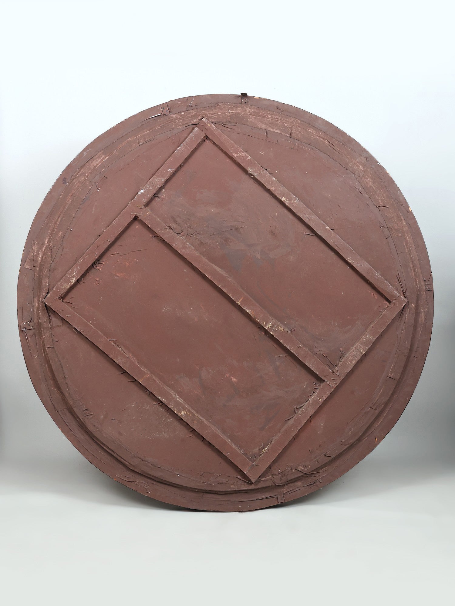 The circular form contains the entire assembly within a continuous field, drawing the viewer inward and holding attention at its centre.