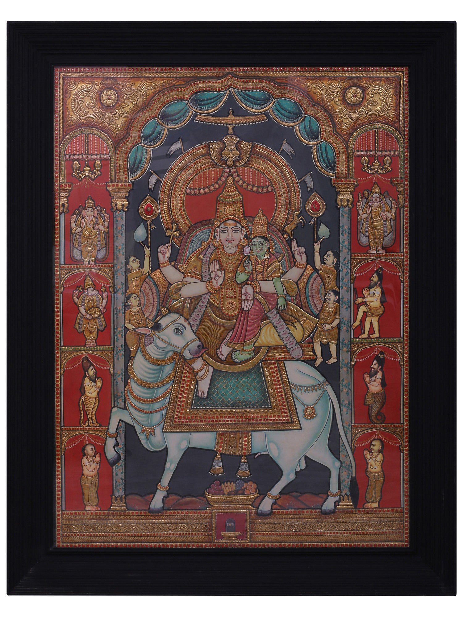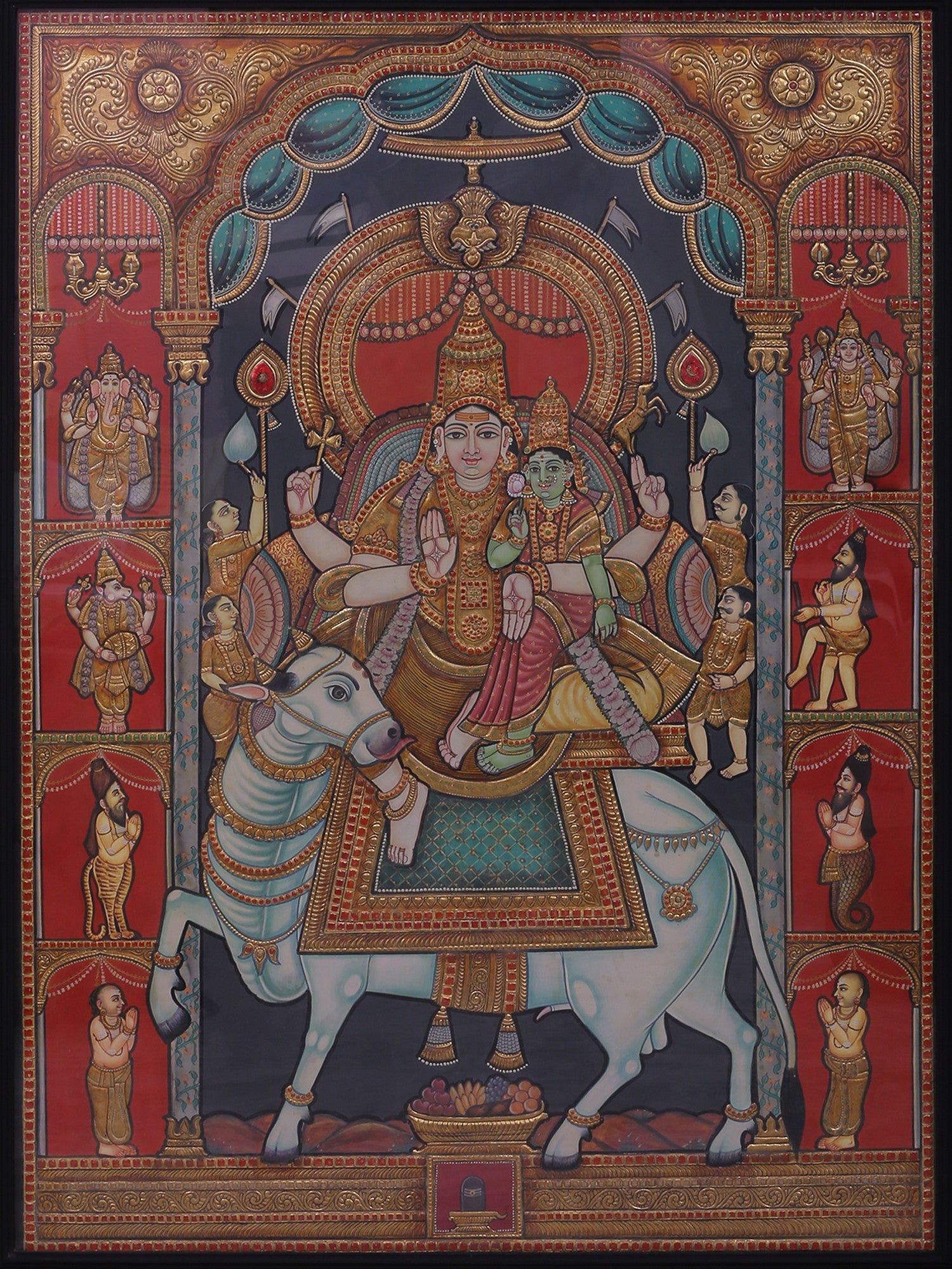 They are placed within a deep, gold-worked mandapam, supported by pillars and enclosed by an ornate arch crowned with a kirtimukha. The throne rests upon Nandi, shown in a turning motion that introduces movement into an otherwise frontal arrangement. Flanking registers include Ganesha and Kartikeya above, with attendants such as Bhringi and Nandikeshwara below.