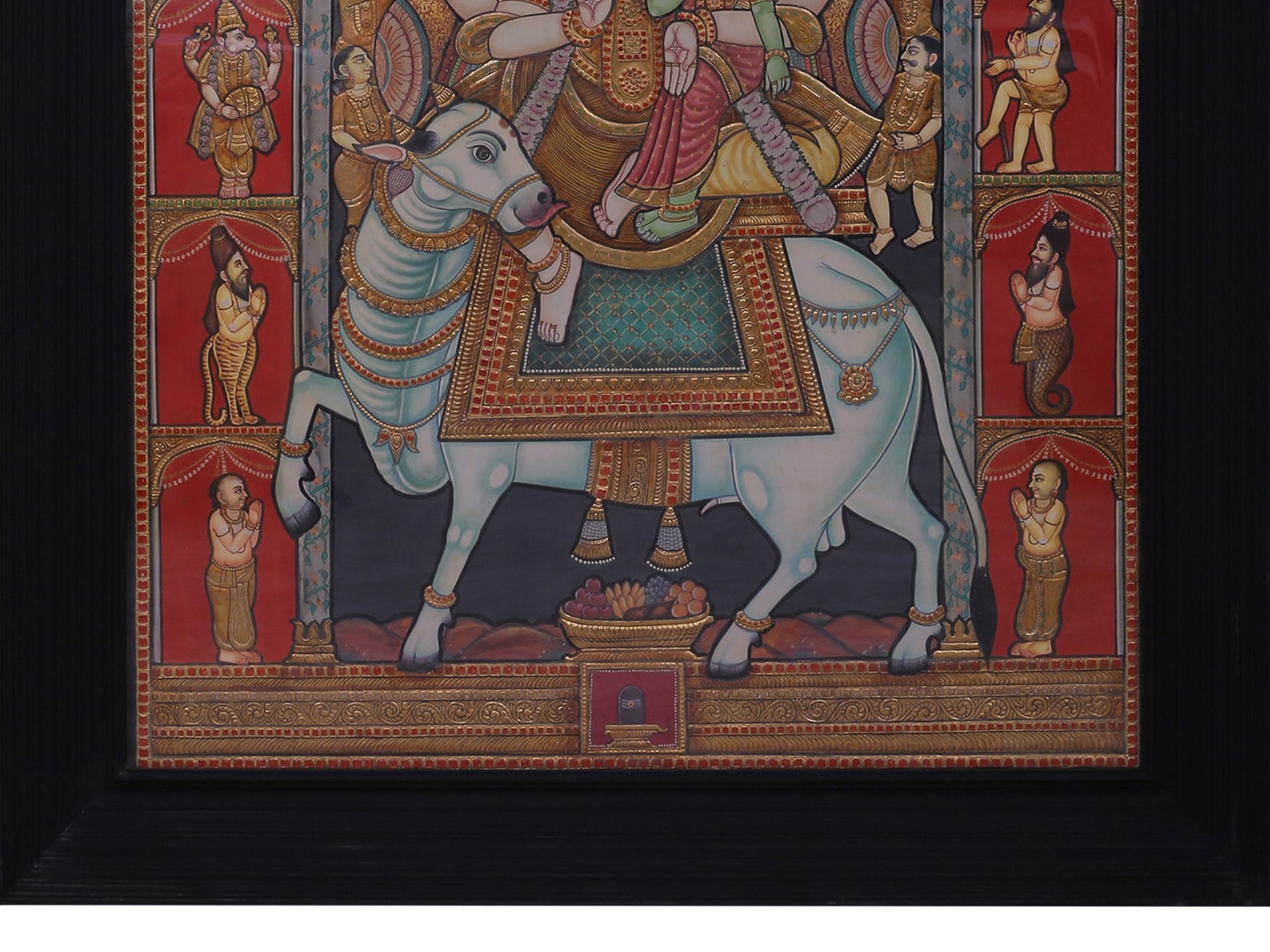 Ritual elements, including a Shiva Lingam, fruit offerings, and royal insignia reinforce temple context. Gold is applied in layered relief across crowns, jewellery, and architectural surfaces, producing a structured, luminous surface held within the teakwood frame.